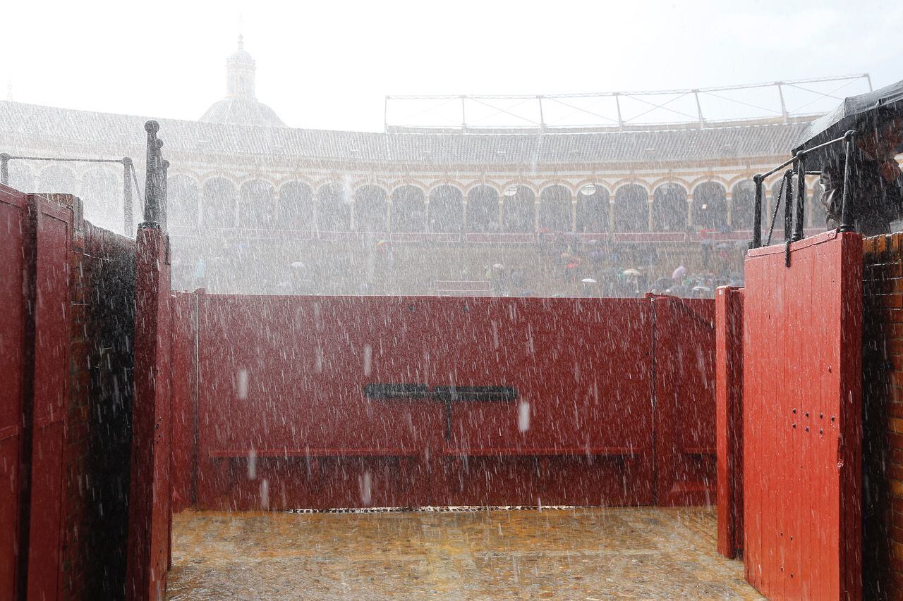 No fue el Domingo de Resurrección luminoso que Sevilla espera en esta fecha. Estaba previsto que lloviera por la mañana, como así sucedió, y que escampara al mediodía, y escampó. Pero la sorpresa llegó por la tarde. Una tormenta se coló inesperadamente en el cielo sevillano, lo encapotó y oscureció, comenzó con un goteo débil y espaciado hacia las cinco, y pronto se convirtió en una espesa cortina de agua, justamente cuando los alrededores de La Maestranza se poblaban de paraguas. Lo que empezó con cuatro gotas acabó en una tromba de agua que puso en muy serio peligro la celebración del festejo. Una hora antes de las seis y media, momento previsto para que se abriera el paseíllo, los empleados de la plaza habían retirado la lona que ha cubierto el albero durante toda la muy lluviosa Semana Santa, por lo que el piso se empapó hasta quedar embarrado.